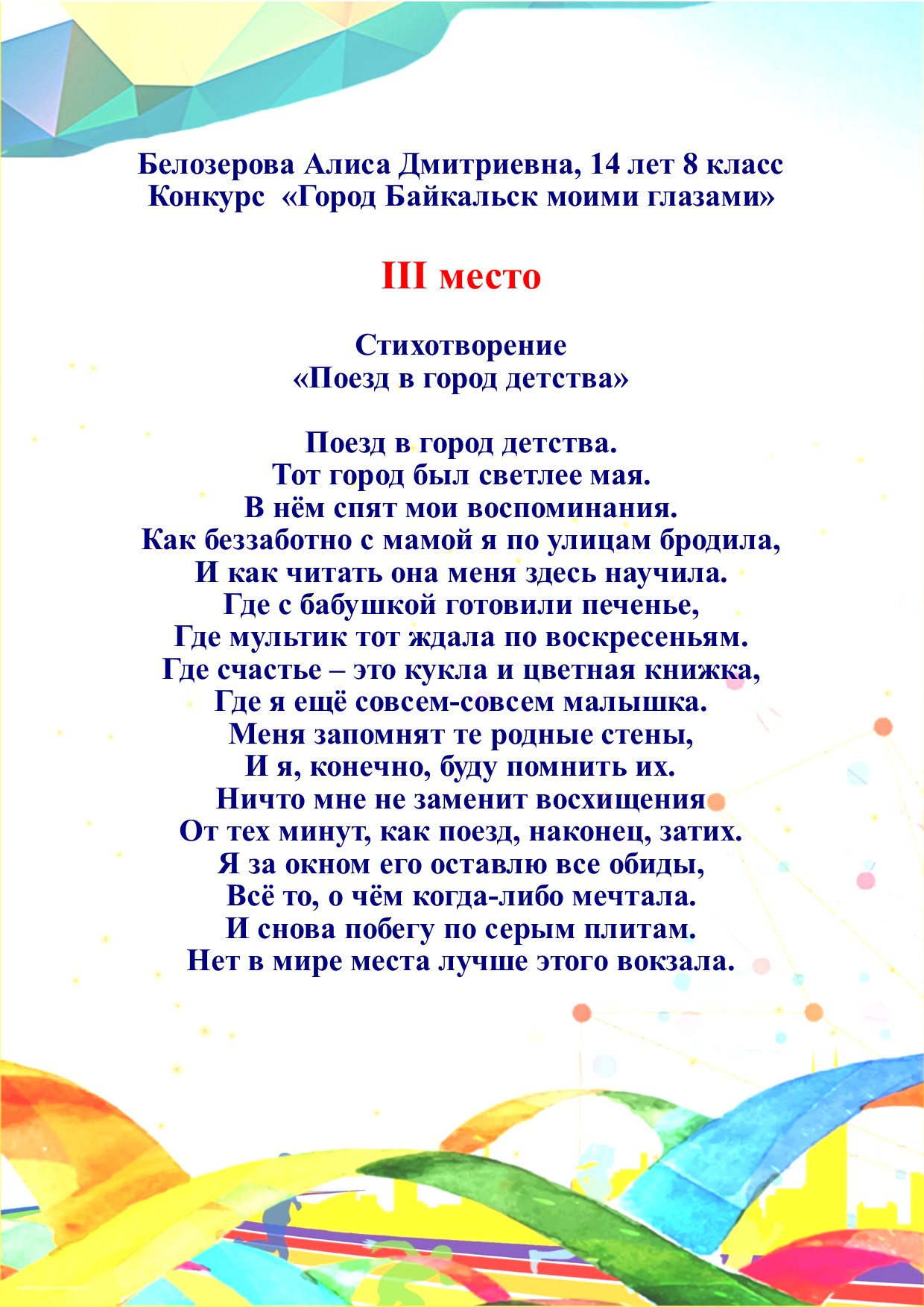 Белозерова Алиса Дмитриевна, 14 лет 8 класс | «Поезд в город детства» | 3 место |