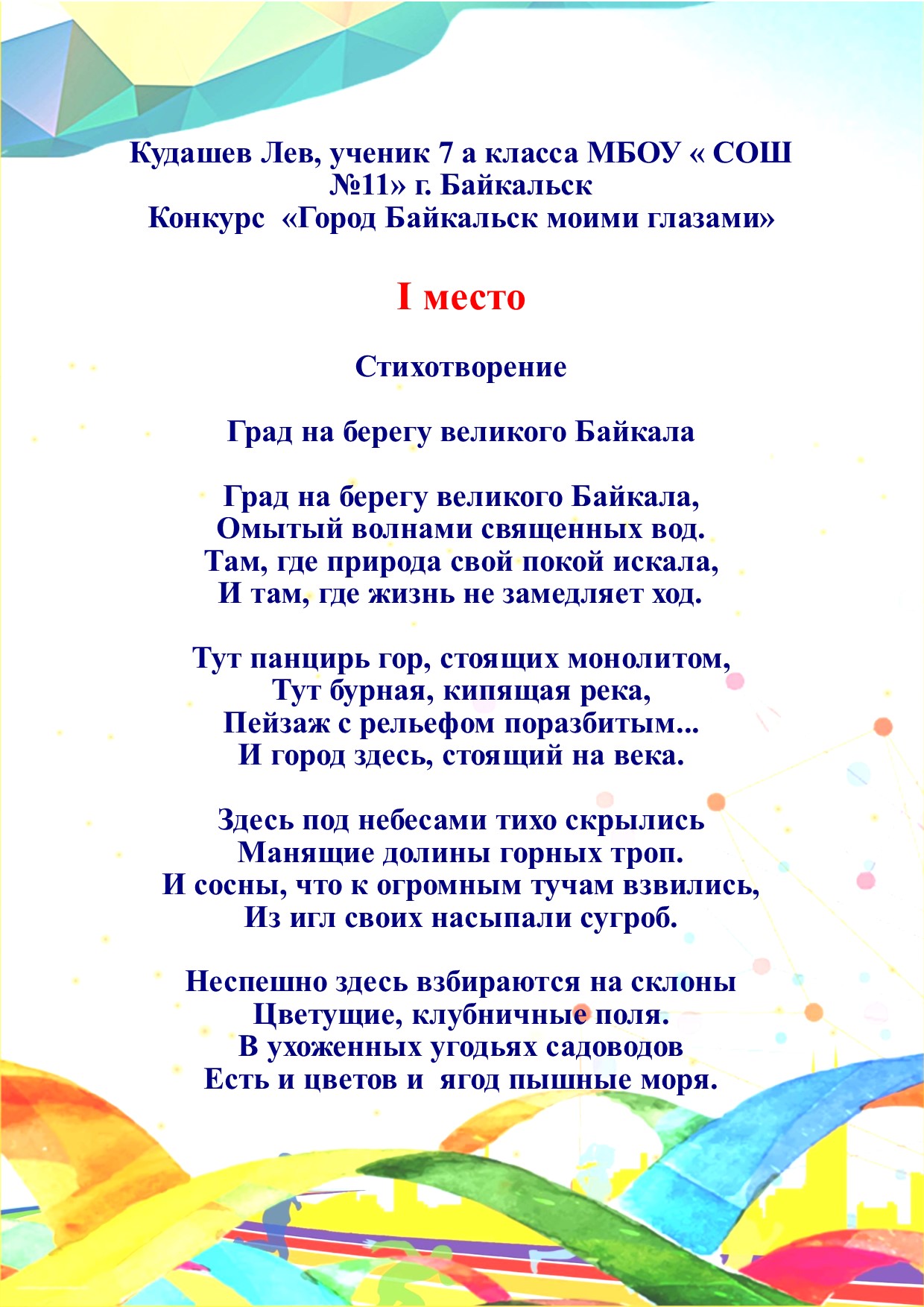 Кудашев Лев, ученик 7 | Град на берегу великого Байкала | 1 место |