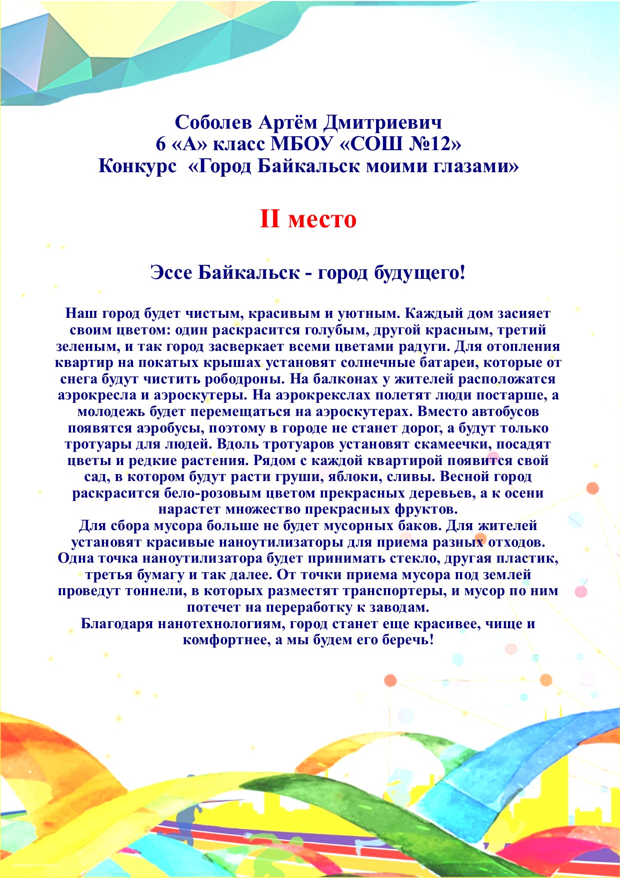 Соболев Артём Дмитриевич 6 «А» | «Байкальск-город будущего!» | 2 место |