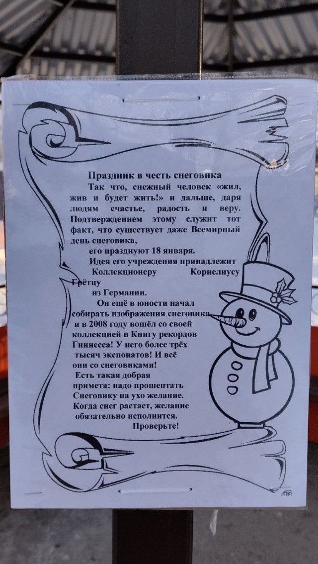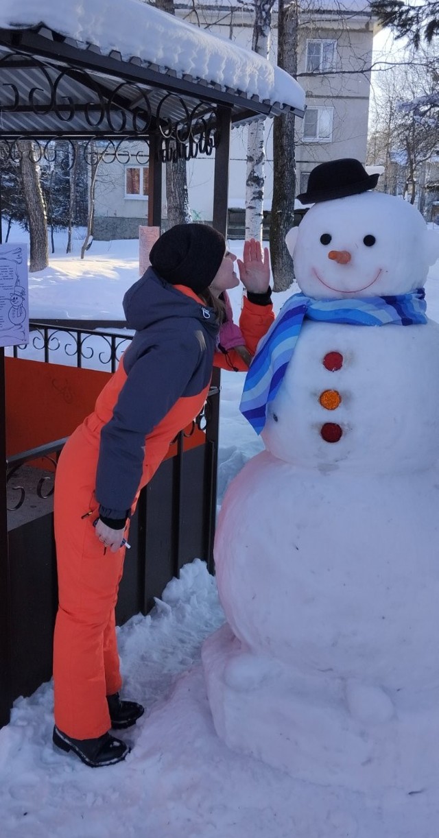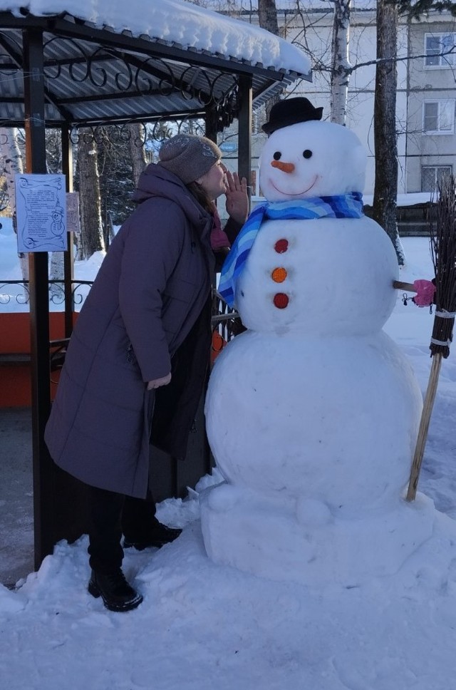 В преддверии праздника городская библиотека руками наших сотрудниц изготовила своего снежного персонажа. Он ждёт всех возле беседки. Успейте загадать желание!