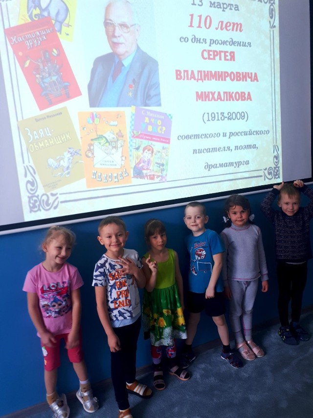 В начале мероприятия прозвучала веселая «Песенка друзей» на стихи С. Михалкова. На слайдовой презентации дети увидели портрет поэта, обложки и иллюстрации его книг. Кратко познакомились с биографией Михалкова, узнали о том, что Сергей Владимирович является автором гимна нашей страны, также ему принадлежат слова, высеченные на плите, лежащей на могиле Неизвестного солдата – «Имя твое неизвестно, подвиг твой бессмертен».