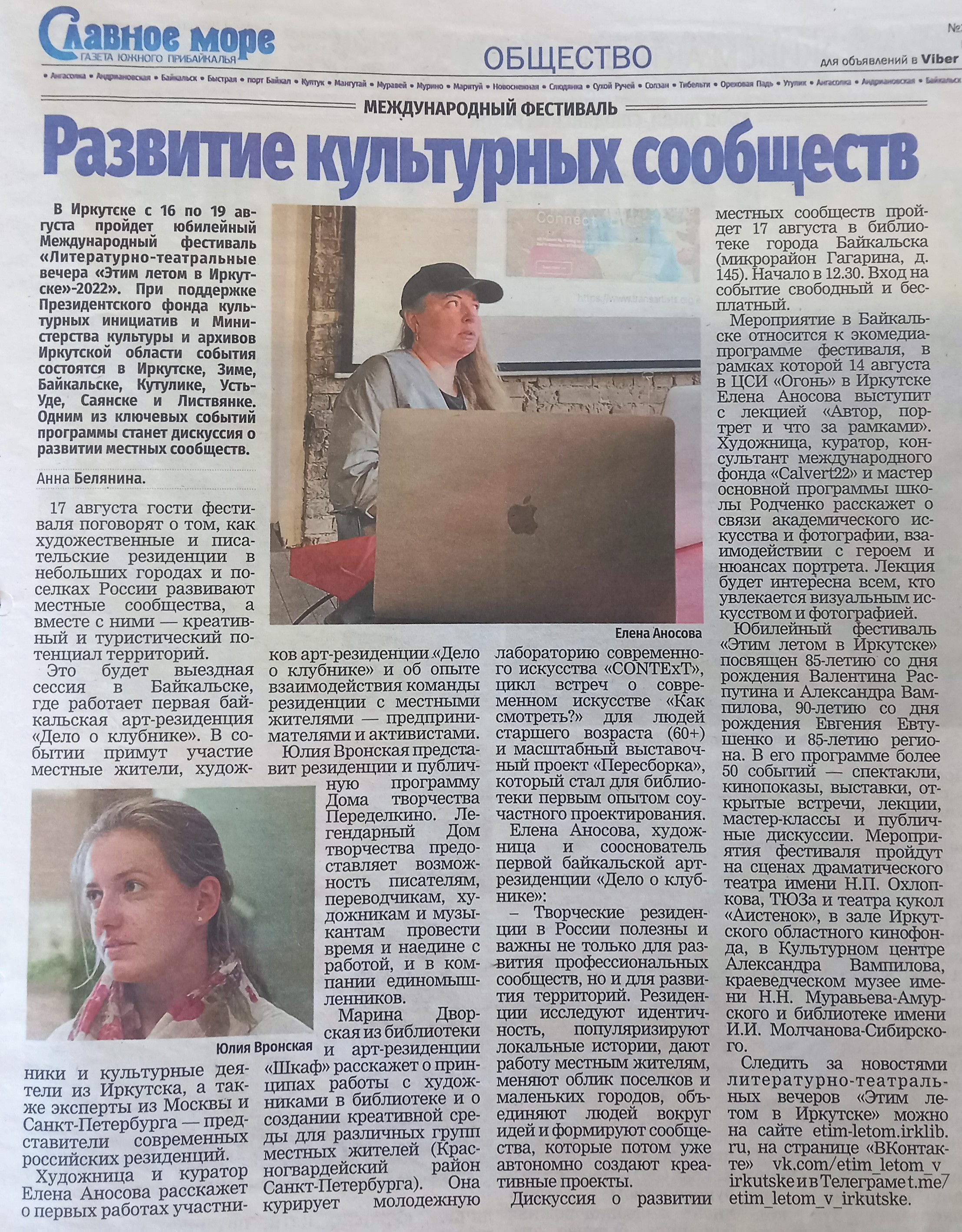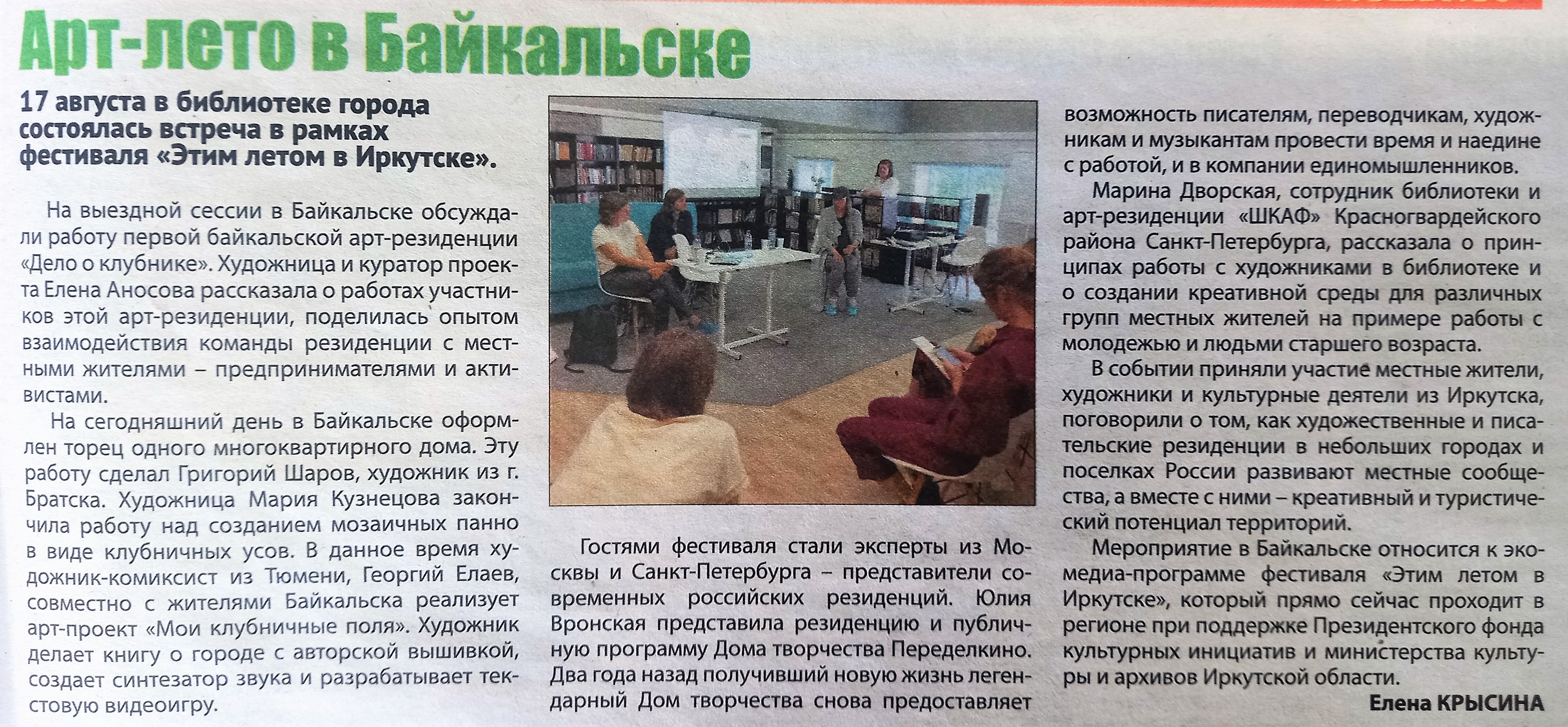 (17 августа в библиотеке г. Байкальска в рамках фестиваля «Этим летом в Иркутске» пройдет встреча с представителями арт-резиденций, в т.ч. «Дело о клубнике»)