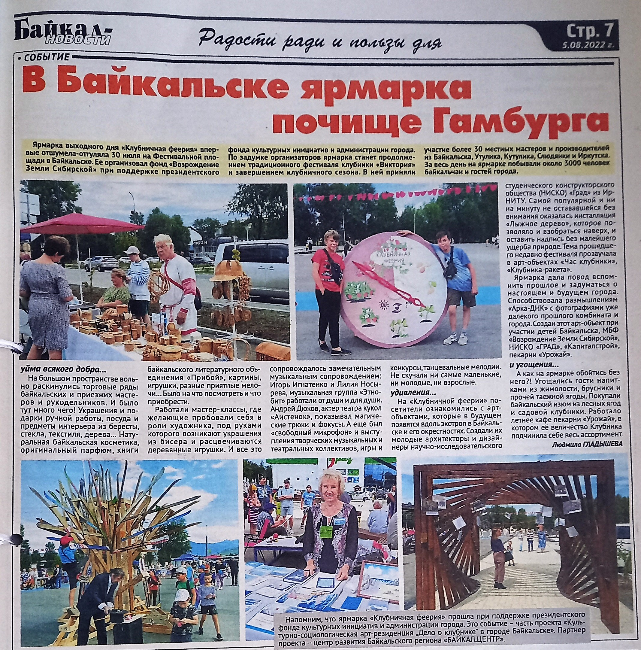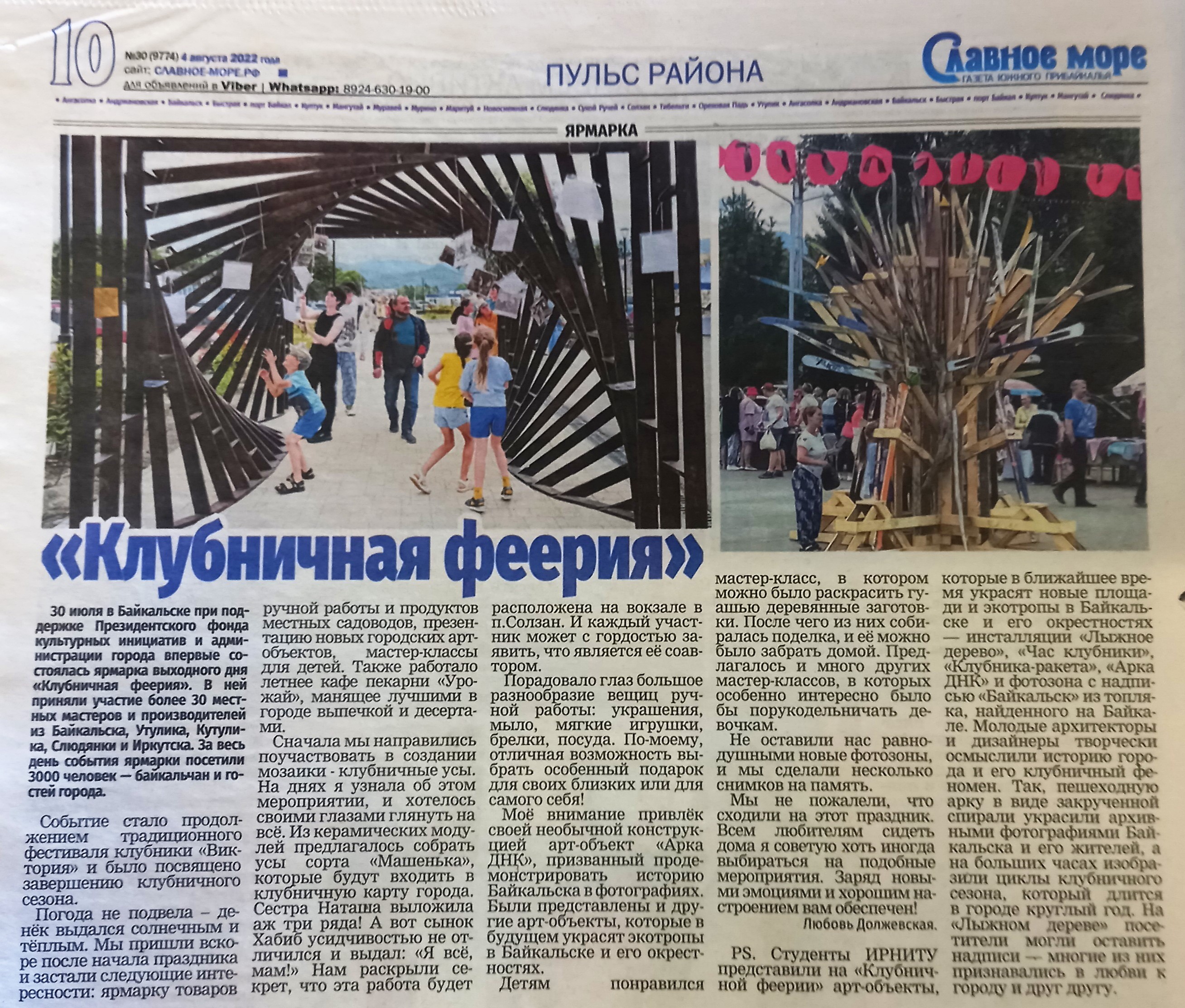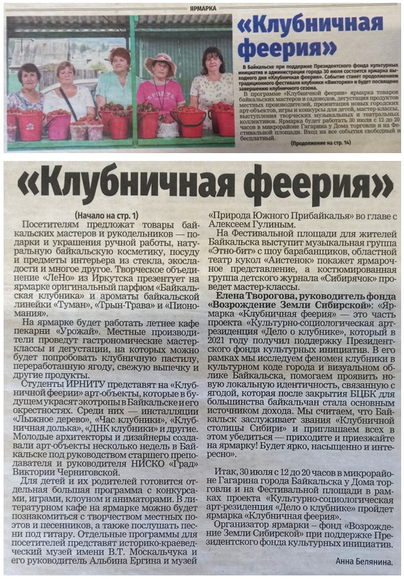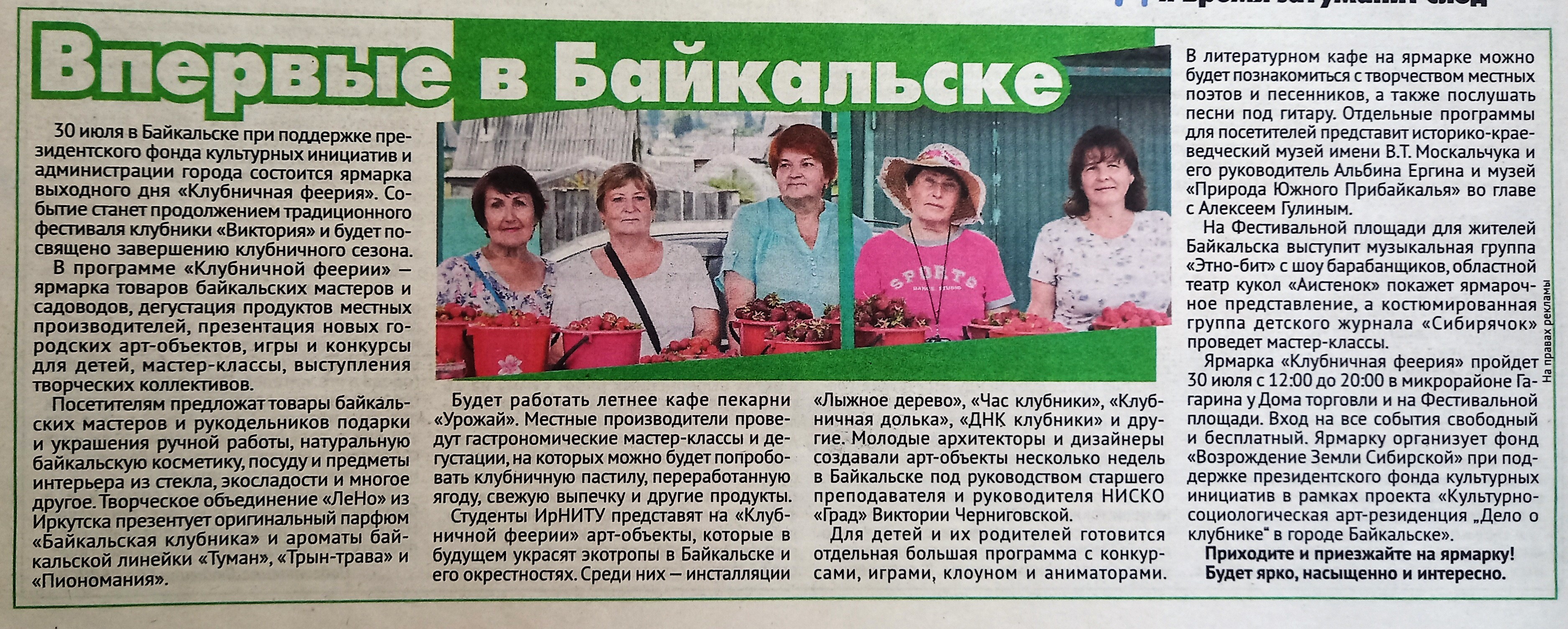 (30 июля в Байкальске состоится ярмарка выходного дня «Клубничная феерия» в рамках реализации проекта арт-резиденции «Дело о клубнике»)