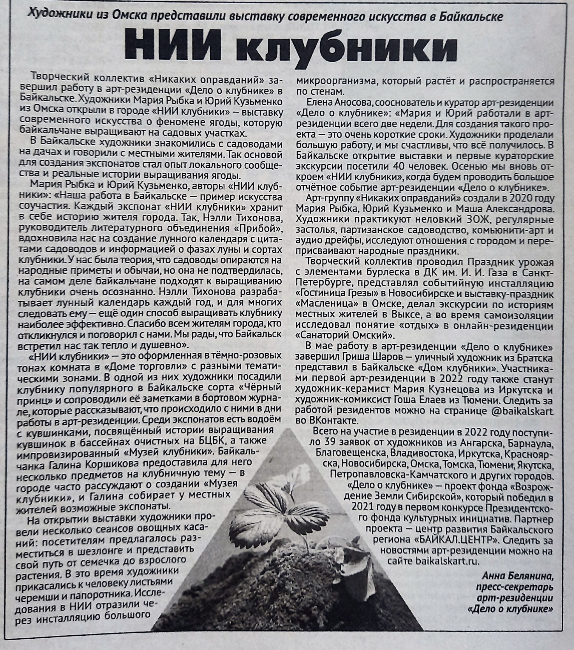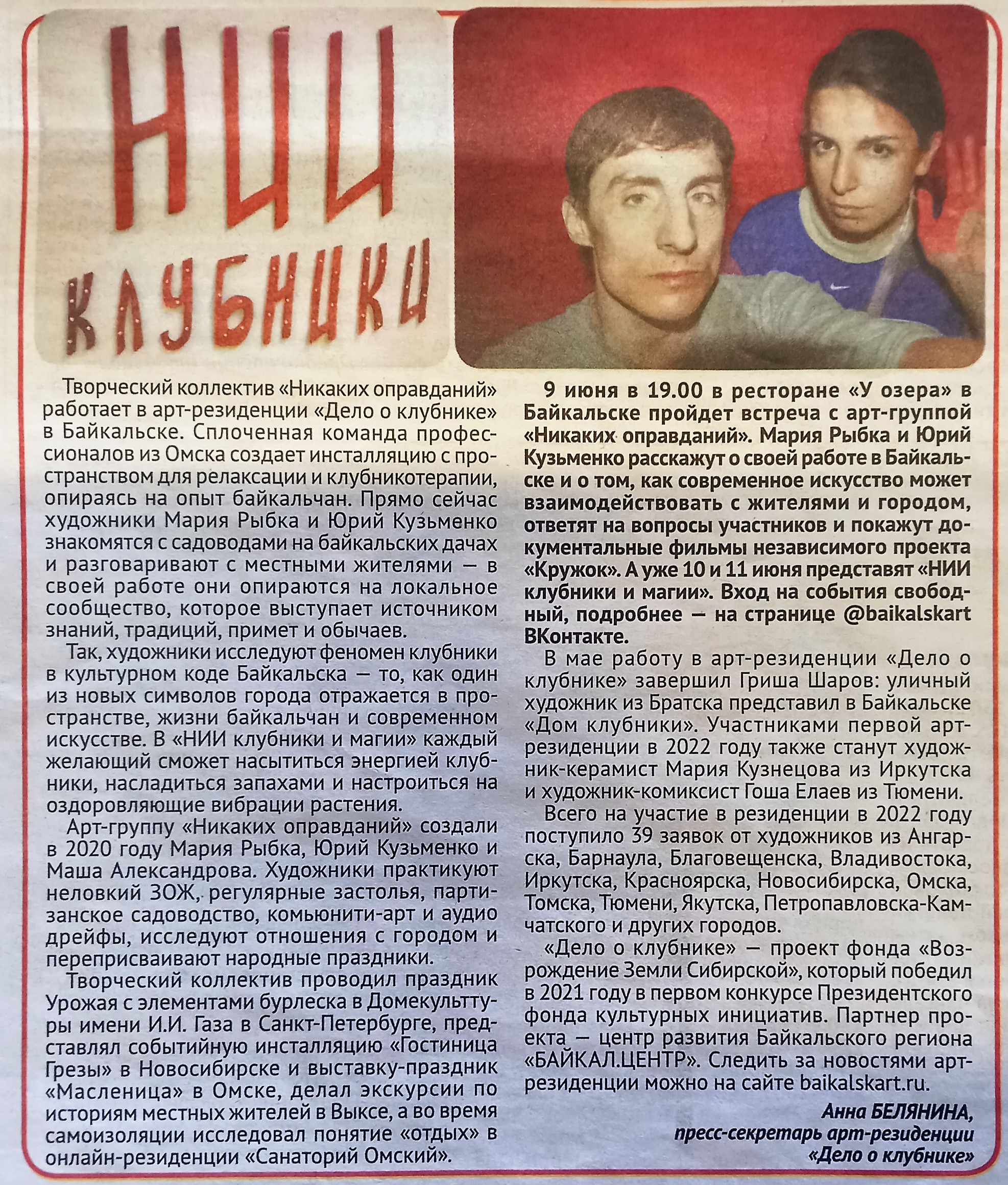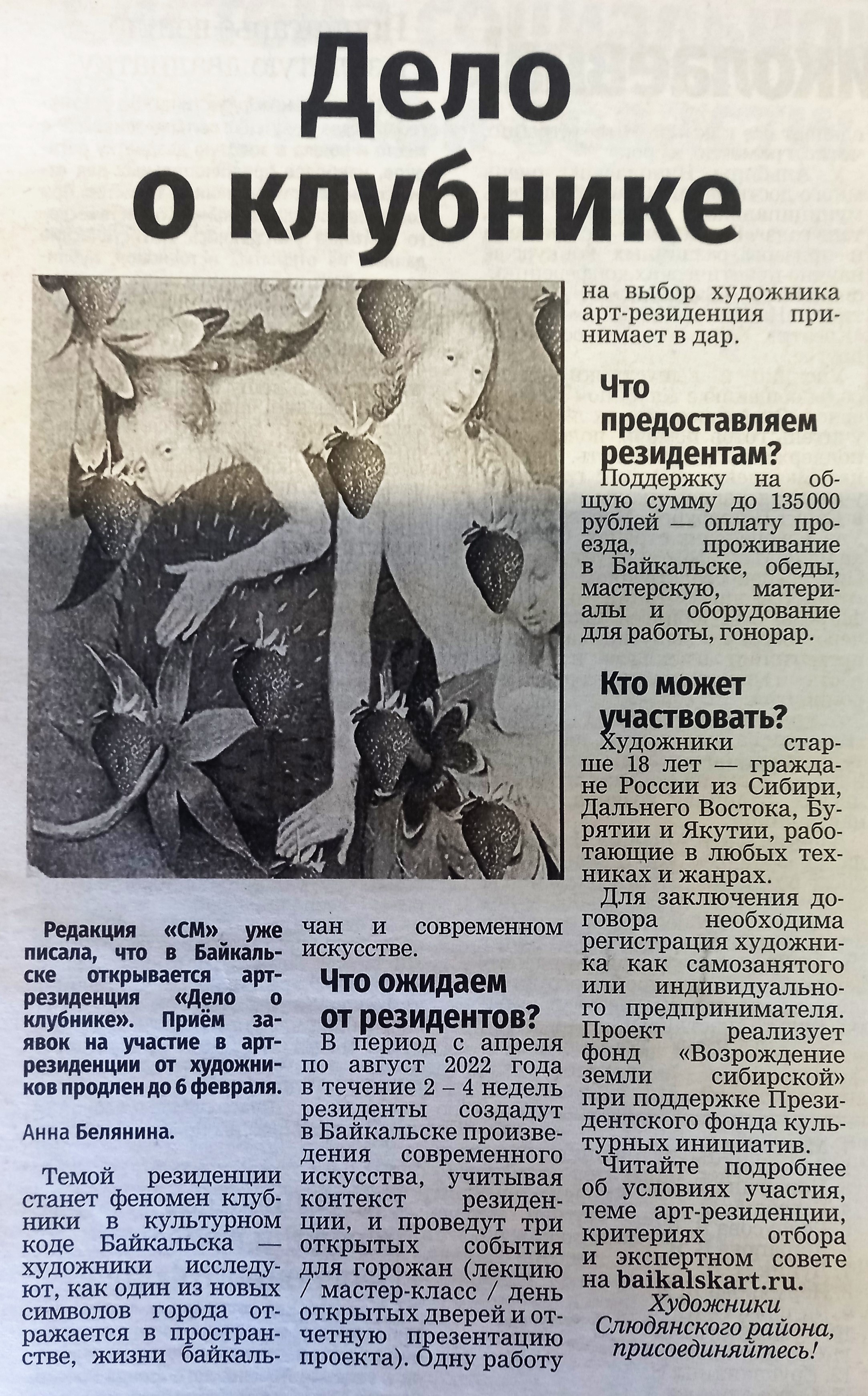 Арт-резиденция «Дело о клубнике» – это место творчества, художественного поиска и культурологических исследований на берегу Байкала. В первом сезоне работы арт-резиденции кураторы и участники проекта исследовали феномен клубники в культурном коде Байкальска, создали интересные арт-объекты, провели несколько открытых просветительских лекций и встреч, организовали конкурс на лучшее изображение для приветственных открыток «Привет из Байкальска – клубничной столицы Сибири». Здесь вы можете познакомиться со всеми газетными статьями, которые освещали деятельность арт-резиденции.