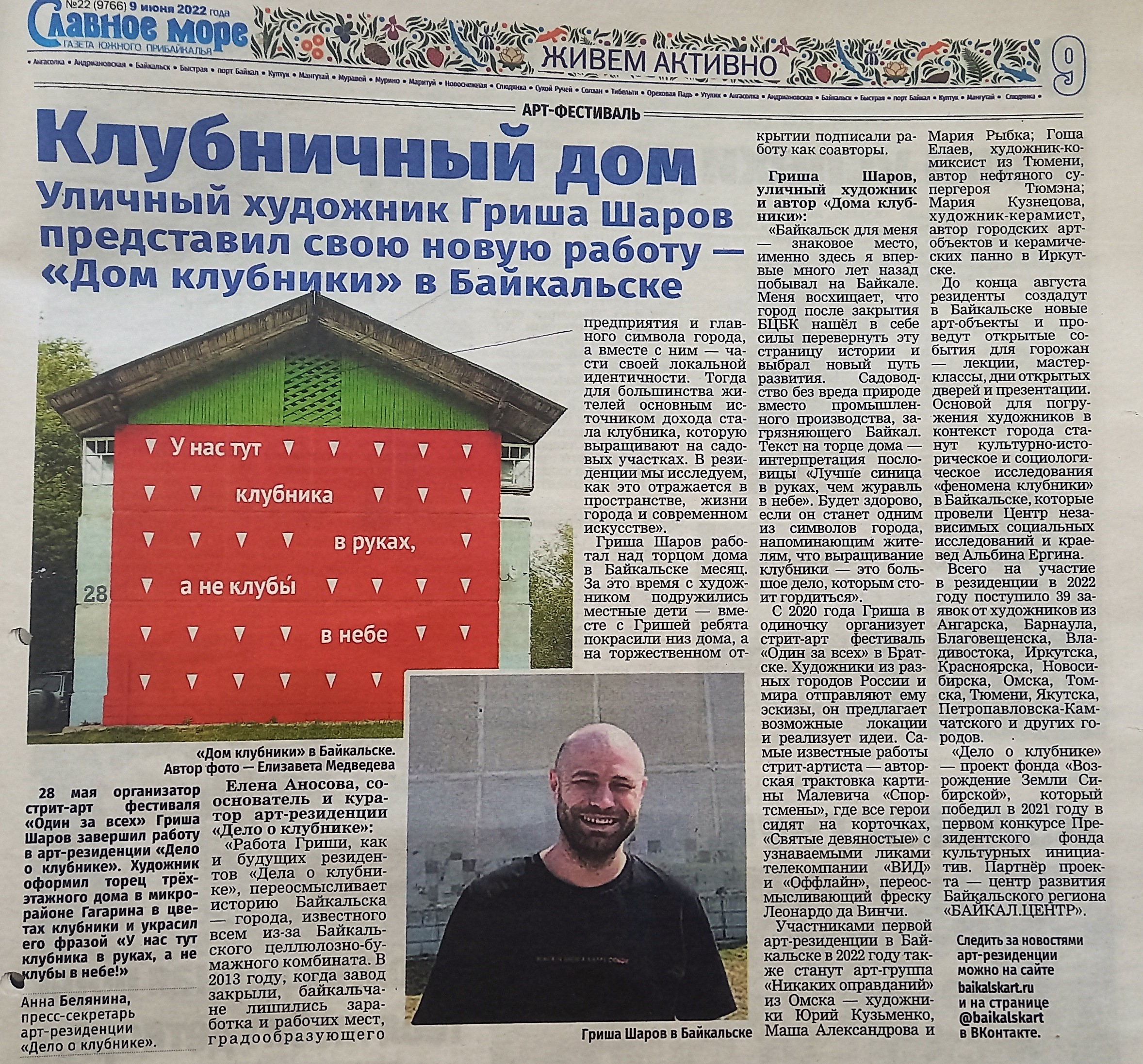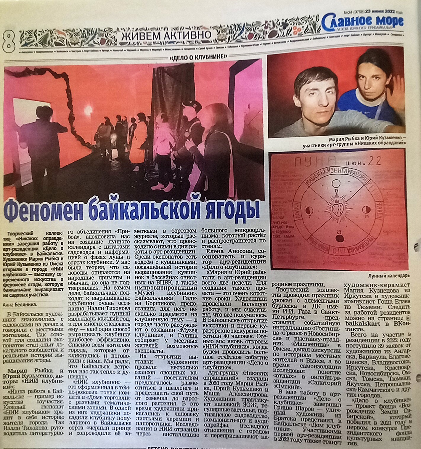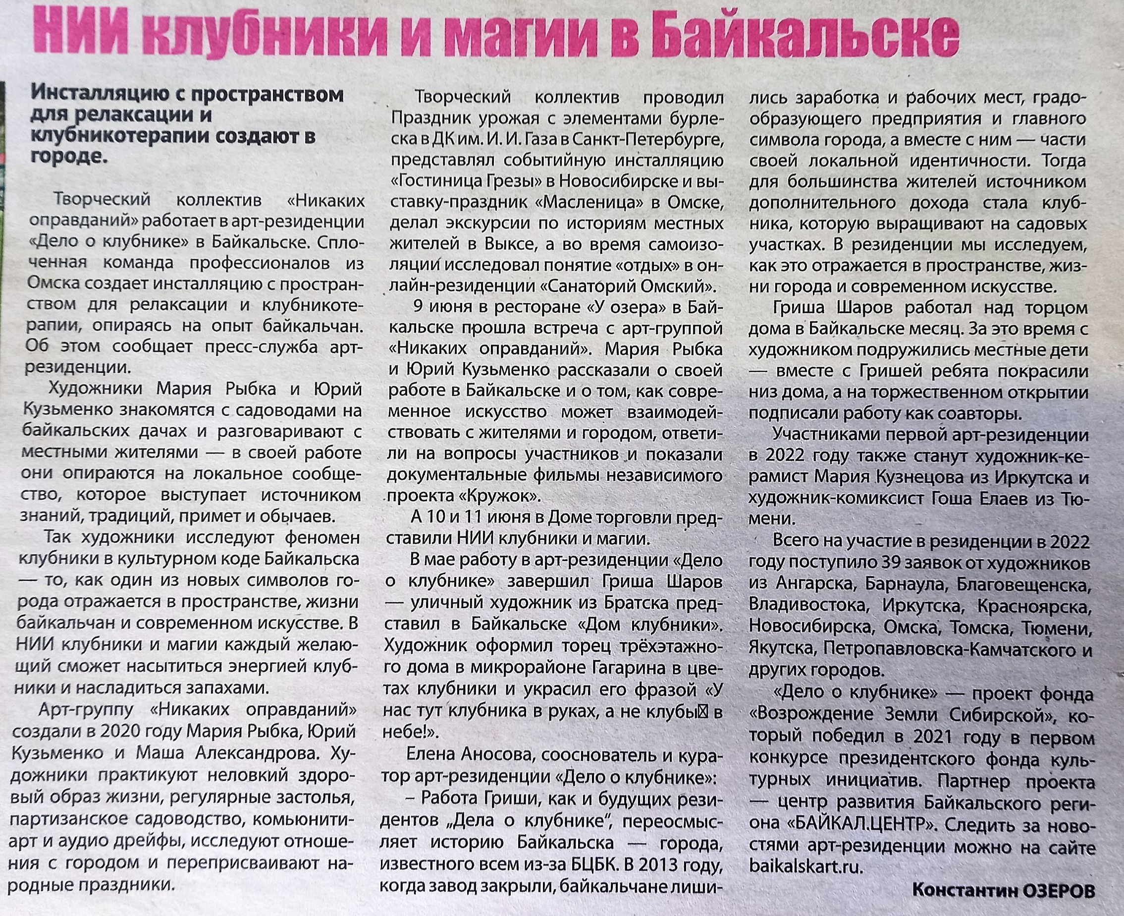 Арт-резиденция «Дело о клубнике» – это место творчества, художественного поиска и культурологических исследований на берегу Байкала. В первом сезоне работы арт-резиденции кураторы и участники проекта исследовали феномен клубники в культурном коде Байкальска, создали интересные арт-объекты, провели несколько открытых просветительских лекций и встреч, организовали конкурс на лучшее изображение для приветственных открыток «Привет из Байкальска – клубничной столицы Сибири». Здесь вы можете познакомиться со всеми газетными статьями, которые освещали деятельность арт-резиденции.