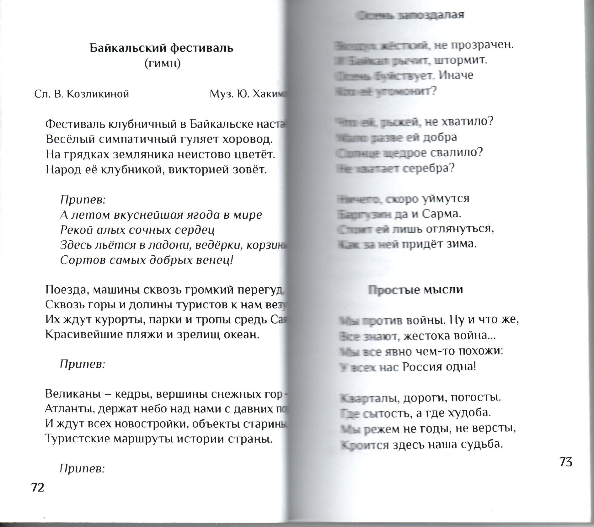 1. Козликина В. Байкальский фестиваль : гимн / слова Валентины Козликиной, музыка Юрия Хакимова // У подножья Хамар-Дабана : [сборник стихов]. – Улан-Удэ, 2013. – С. 72.