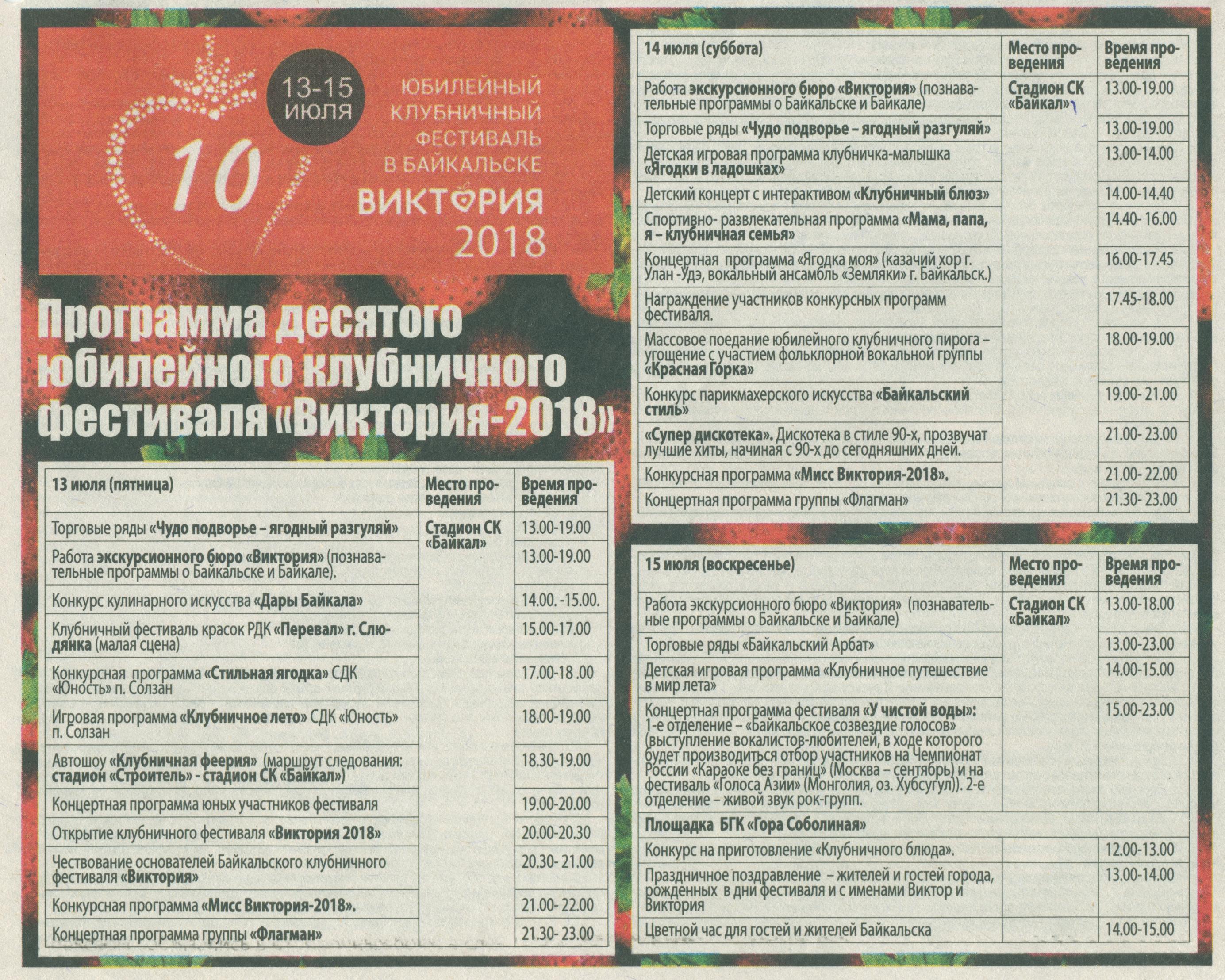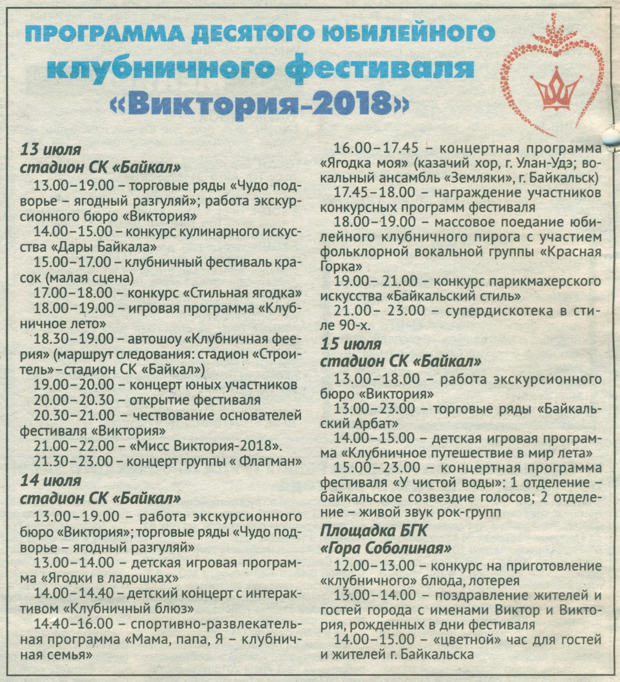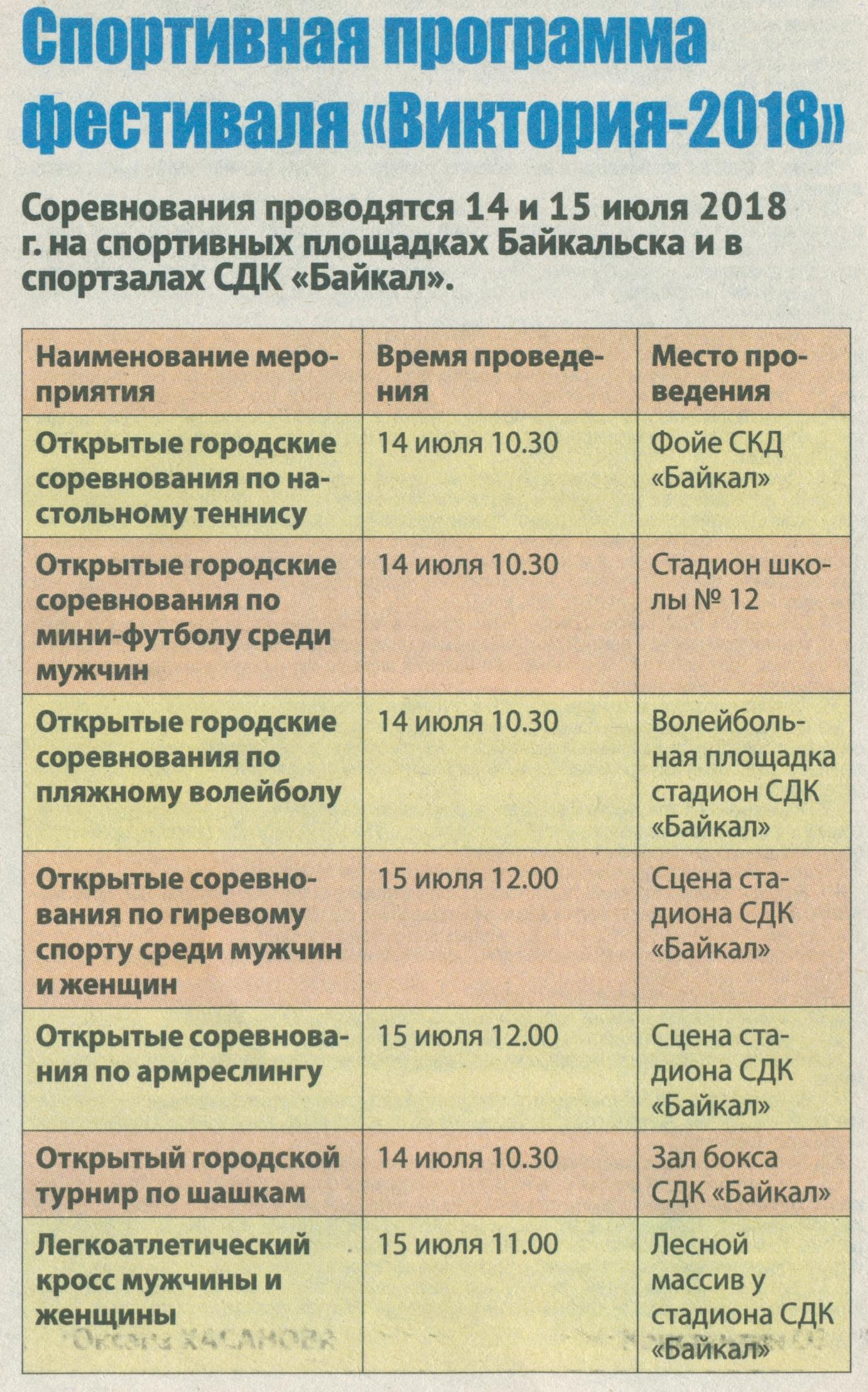 4. Спортивная программа фестиваля «Виктория – 2018» // Байкальская газета. – 2022. – № 27. – С. 7.