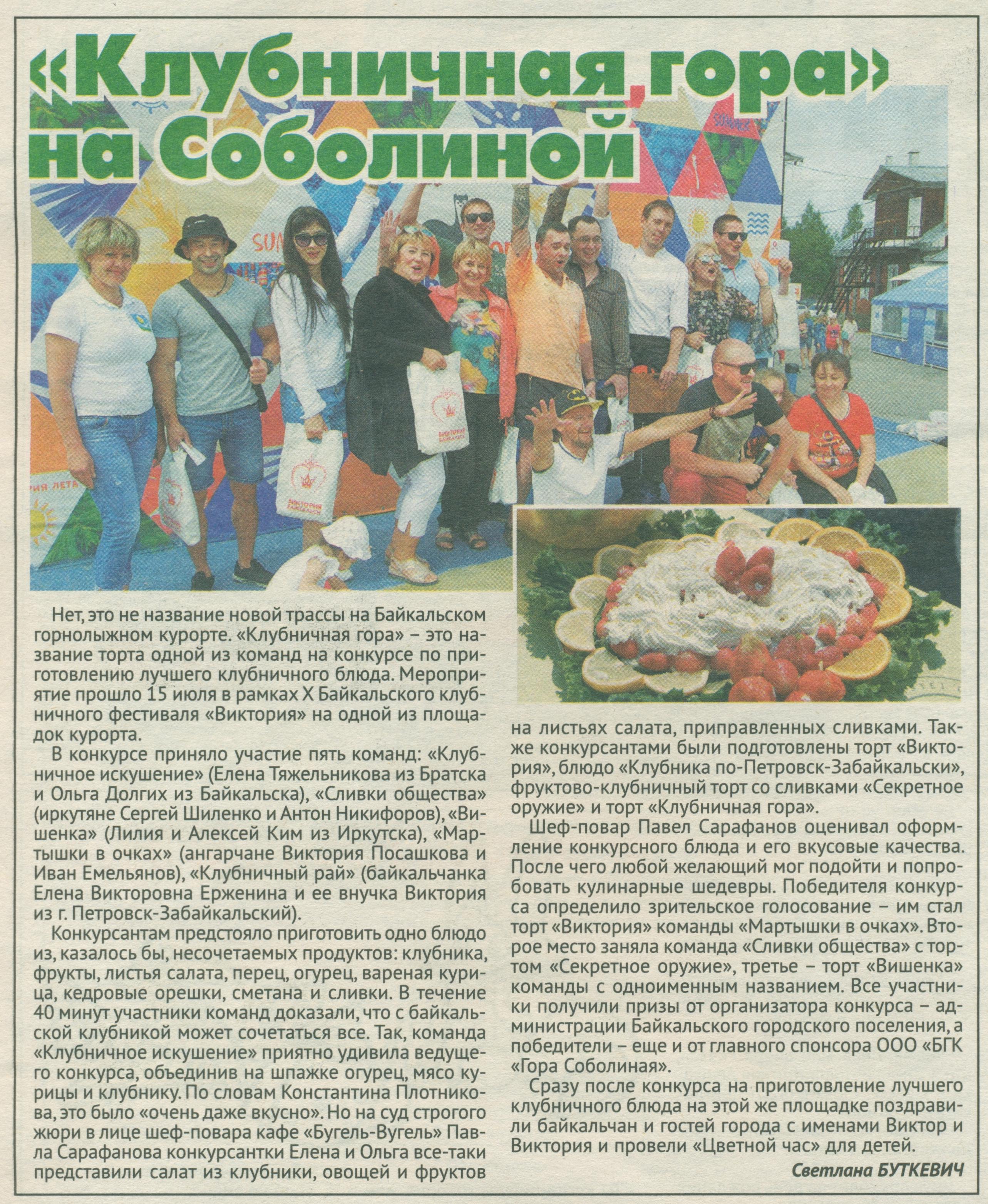 10. Буткевич Светлана. «Клубничная гора» на Соболиной // Байкал-новости. – 2018. – № 28. – С. 8.