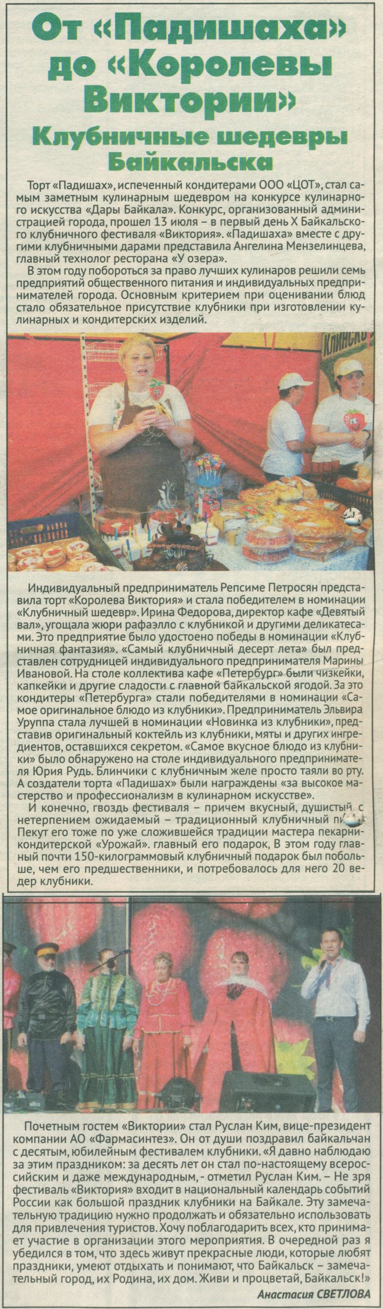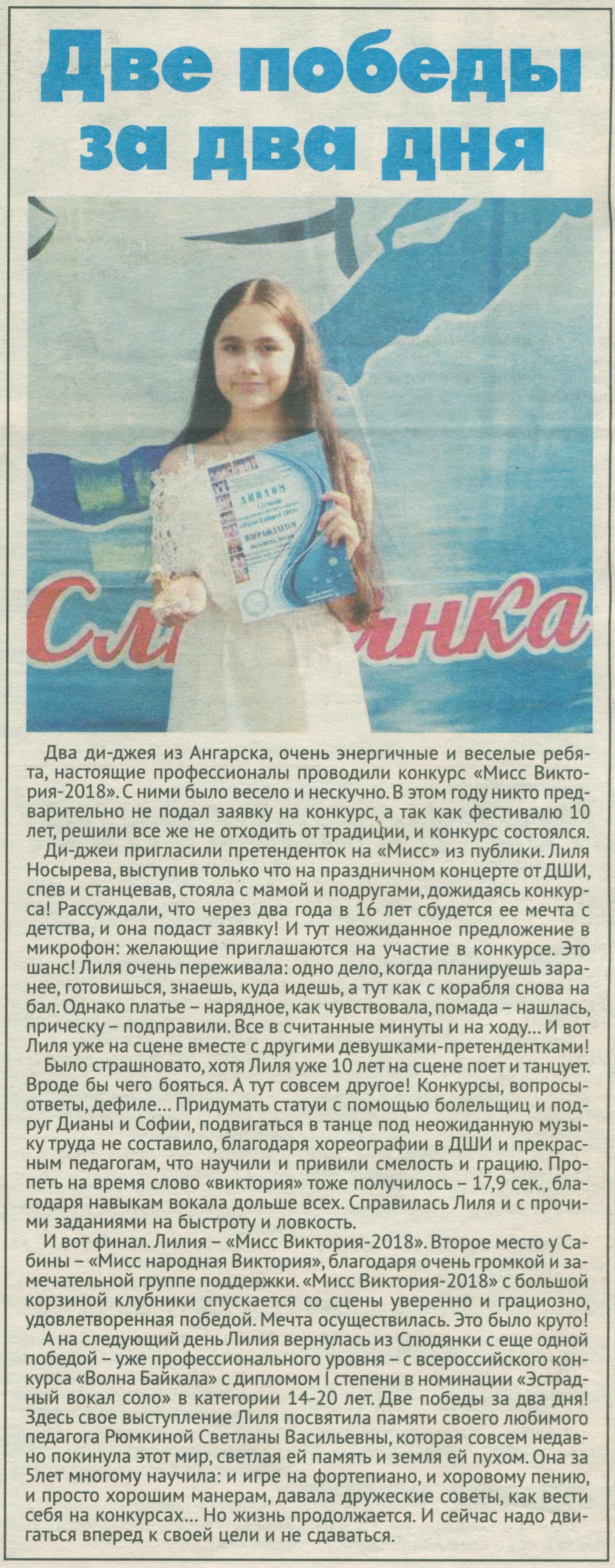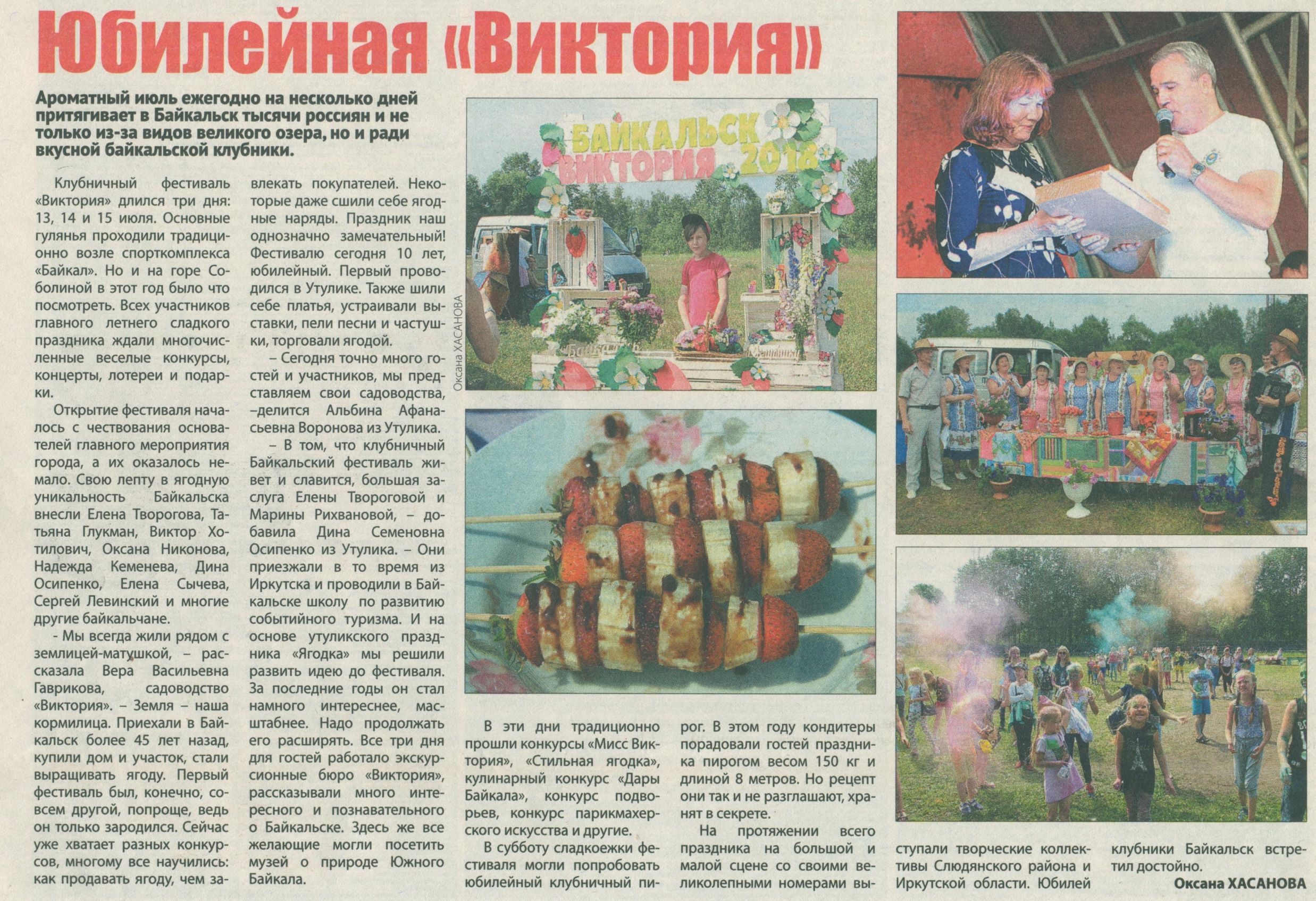8. Хасанова Оксана. Юбилейная «Виктория» // Байкальская газета. – 2018. – № 28. – С. 6.