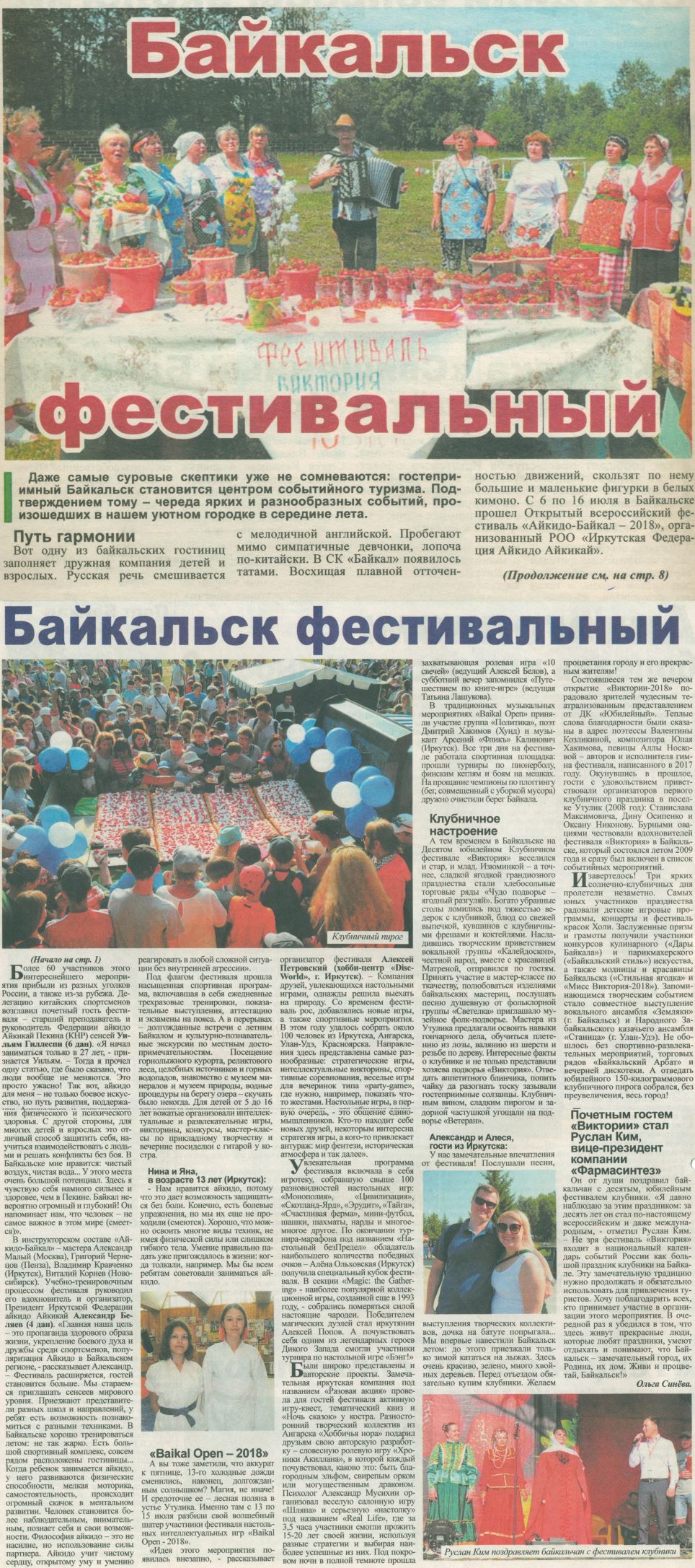 5. Синёва Ольга. Байкальск фестивальный // Славное море. – 2018. – № 28. – С. 1, 8.