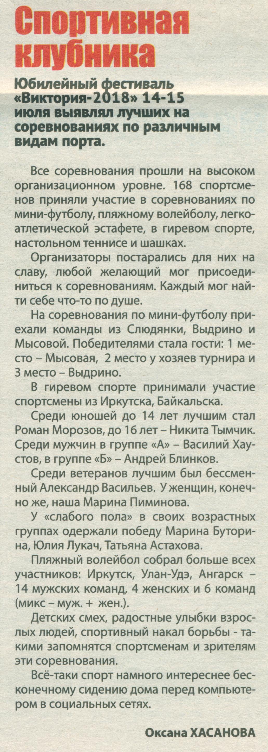 9. Хасанова Оксана. Спортивная клубника // Байкальская газета. – 2018. – № 28. – С. 7.