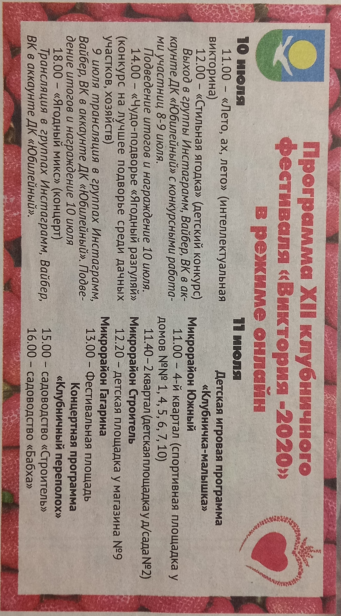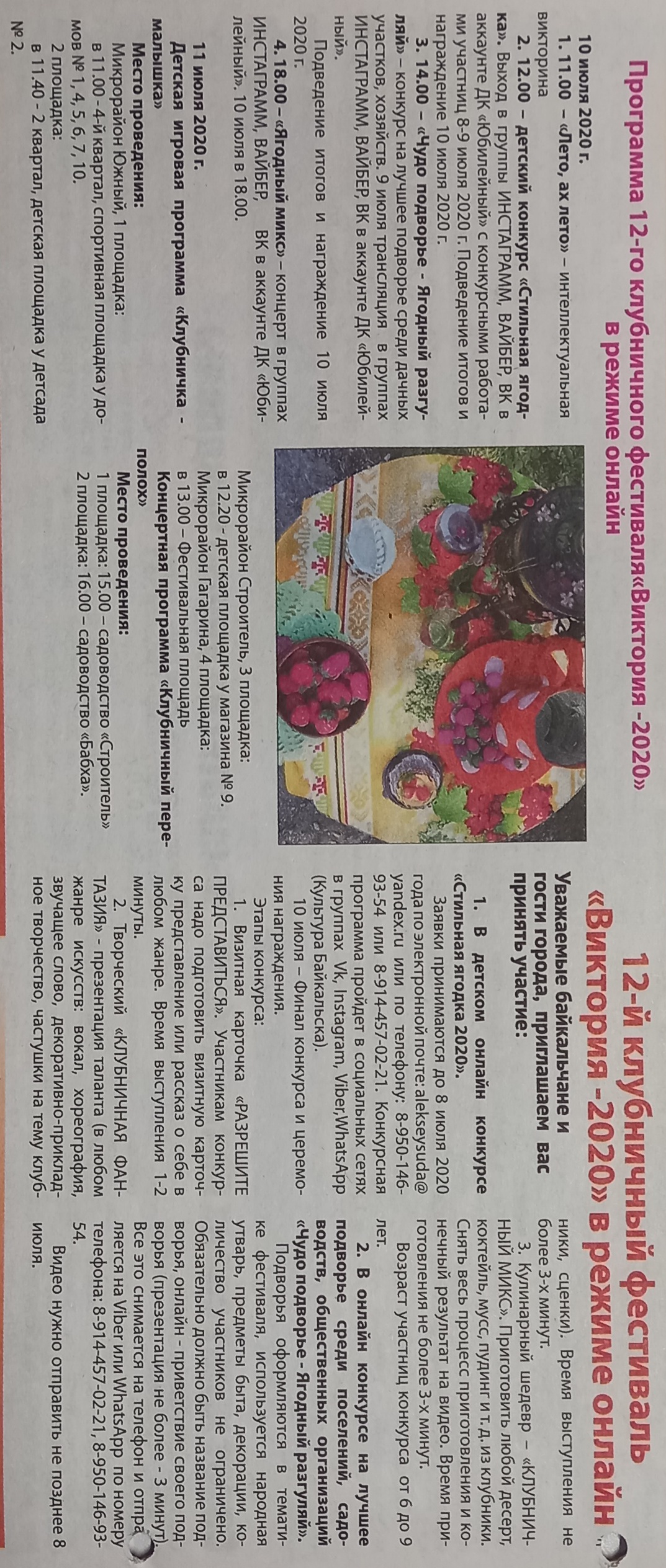 2. Программа XII клубничного фестиваля «Виктория – 2020» в режиме онлайн // Байкал-новости. – 2020 – № 27. – С. 1.