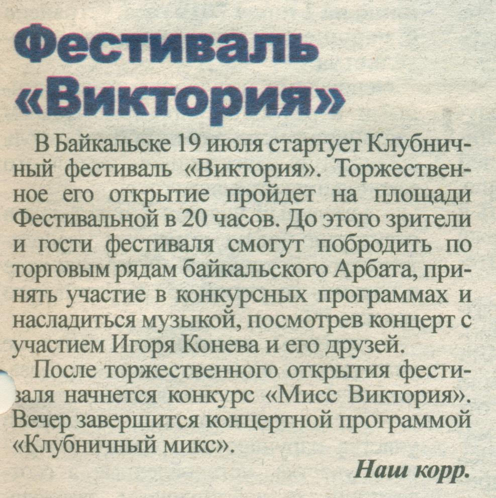 1. Фестиваль «Виктория» : [объявление] // Славное море. – 2019. – № 27. – С. 1.